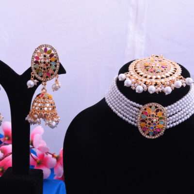 Mirrored Choker Set & Pearls With Earring & Mangtika Mirrored Choker Set & Pear...