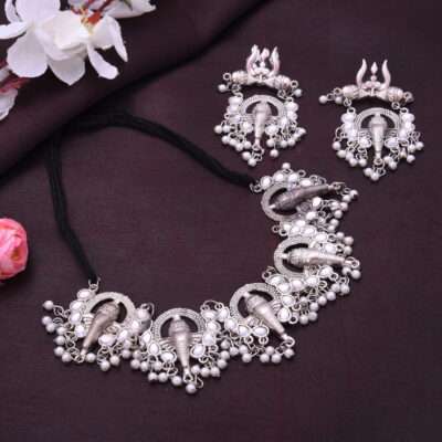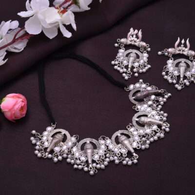 Discover elegance and tradition with our Oxidised Silver Gajanan Choker Set with Earrings, a stunning addition to our Jewels Premium collection at Itsonly SAARA. Explore our extensive range of exquisite sets, including chokers and earrings, meticulously crafted to adorn you for any occasion, from festive gatherings to Bollywood-inspired glam. Our collection seamlessly blends traditional craftsmanship with contemporary flair, featuring intricate embellishments, oxidized finishes, pearls, and stones. Whether you’re seeking the perfect accessory for a festive celebration, a Haldi/Mehndi ceremony, or a chic kitty party, our Ethnic, Fusion, and Bollywood collections offer timeless beauty and style. Elevate your neck jewellery game with Itsonly SAARA’s exquisite chokers and embrace the allure of Indian heritage with every piece.