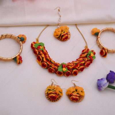 Discover the epitome of elegance with our Florets Fabric Necklace Set featuring intricate fabric work and adorned with dazzling embellishments, complemented by matching earrings and maangtika. Perfect for occasions ranging from baby showers to weddings, our Bollywood-inspired collection boasts bridal sets, contemporary designs, and floral motifs, all meticulously handmade with premium jewels. Explore our diverse range of neck jewellery, including necklace sets and short sets, curated for every celebration in mind, whether it’s a vibrant Haldi/Mehndi ceremony or a grand wedding affair. Elevate your ensemble with the exquisite craftsmanship of Itsonly SAARA’s fabric work collection, designed to add a touch of sophistication to any look.