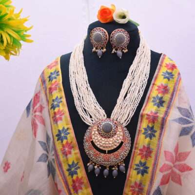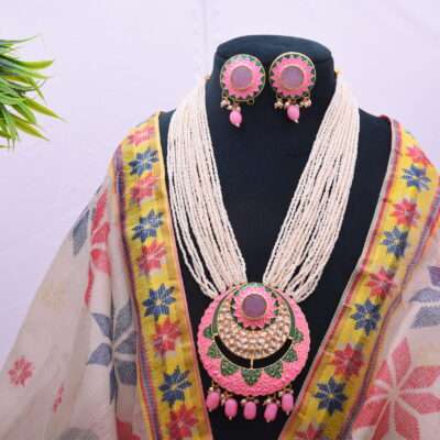 Discover timeless elegance with our Pearl Meenakari Long Necklace Set, accompanied by exquisite stud earrings, exclusively from our Antique Collection at Itsonly SAARA. Handcrafted with precision and adorned with intricate embellishments, this set seamlessly blends the essence of tradition with contemporary flair, making it perfect for any occasion, from engagements to weddings and festive celebrations. Immerse yourself in the rich heritage of Kundan Meenakari craftsmanship, meticulously showcased in every detail of our Rajwada Collection. Whether it’s a Haldi ceremony or Sangeet night, our Fusion Collection offers the perfect balance of ethnic charm and modern sophistication. Elevate your ensemble with our Jewels Premium line, featuring stunning pearl accents and delicate stone embellishments, ideal for creating unforgettable memories. Explore the essence of royalty and grace with our Ranihaars and traditional necklaces, curated to complement every style and personality. Embrace the essence of timeless beauty and sophistication with Itsonly SAARA’s exquisite collection of neck jewellery sets, meticulously designed to adorn you on your special day.