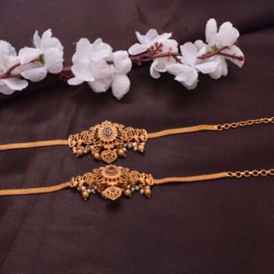 Discover the epitome of regal elegance with SAARA’s Queen’s Armlet (BazuBandh), featuring a captivating fusion of Pearls & Stones intricately set in Antique Gold. This set of two armlets exudes opulence in shades of Green and Pink, ideal for those seeking a blend of tradition and sophistication. Crafted with precision and adorned with premium Copper and Jewels, these armlets are a testament to our commitment to excellence. Explore our extensive range of traditional treasures, including our Antique Collection, Ethnic Collection, Festive Collection, Heritage Collection, and Temple Collection, ensuring you find the perfect accent for every occasion. Whether it’s a wedding celebration or a cultural festivity, elevate your ensemble with our exquisite Bajubandh embellishments, where timeless charm meets modern allure. Browse through our All Jewellery and Other Jewellery categories to uncover more enchanting pieces, and adorn yourself with the timeless allure of pearls, stones, and antique craftsmanship. Experience the essence of grandeur with SAARA, where every piece narrates a tale of heritage and elegance.