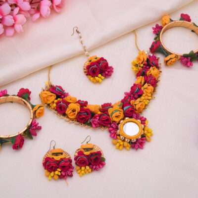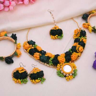 Discover the epitome of elegance with our Sole Mirror Floral Fabric Necklace Set, complete with matching earrings and maangtika, exclusively from itsonly SAARA. Perfect for baby showers, weddings, and any Bollywood-inspired affair, this bridal set embodies contemporary sophistication with its intricate fabric work and embellishments. Handmade with care, our premium jewels feature stunning mirrored accents amidst floral motifs, ideal for haldi or mehndi ceremonies. Explore our curated collections for short sets, necklaces, and more, embracing the essence of every occasion with pearls and neck jewellery that elevate your ensemble to unparalleled heights.