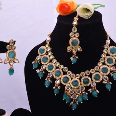 Discover the epitome of elegance with our Stones Necklace Set adorned with matching Earrings & Maangtika from SAARA. Perfect for every occasion from Anniversary celebrations to glamorous Bollywood-inspired soirees, our collection seamlessly blends traditional craftsmanship with contemporary flair. Handcrafted with meticulous attention to detail, each piece boasts exquisite embellishments and premium quality stones, making it a stunning addition to your ethnic or fusion ensemble. Whether it’s for a festive gathering, engagement ceremony, or wedding affair, our curated sets cater to all your jewelry needs. Indulge in the allure of Kundan and beaded accents, or opt for the timeless charm of our Necklaces and Neck Jewellery. With SAARA, elevate your style and make a statement that’s uniquely yours.